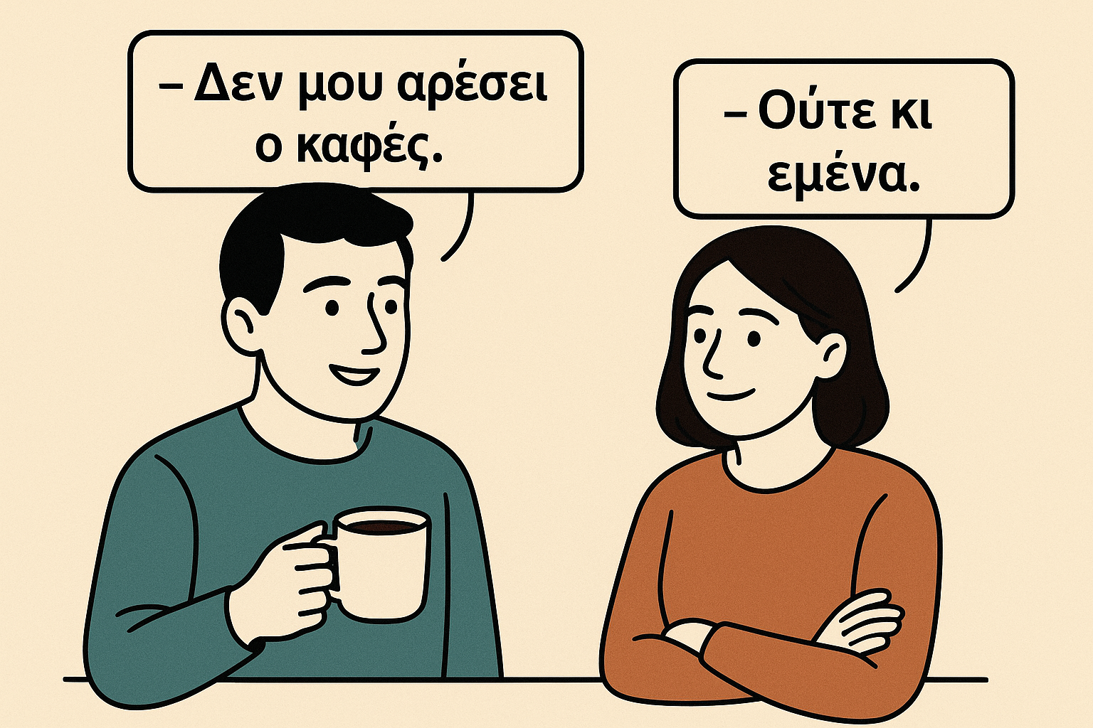 Ούτε κι εμένα μου αρέσει ο καφές. (Мне тоже не нравится кофе.)